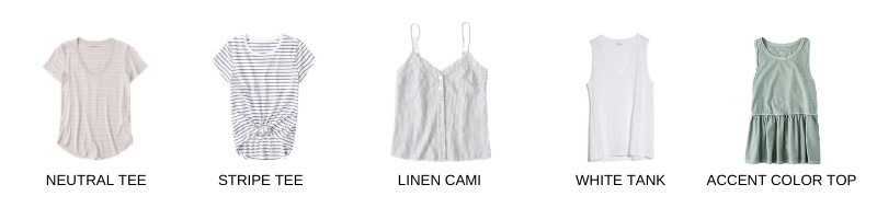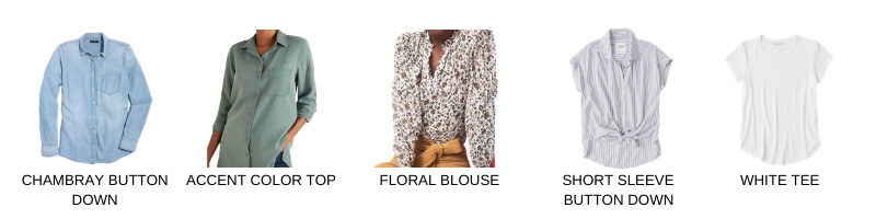 Chambray Top // Long Sleeve Button Down // Floral Blouse // Short Sleeve Button Down // White Tee // Neutral V neck Tee // Stripe Tee // Linen Tank // White Tank // Accent Color Peplum Tank