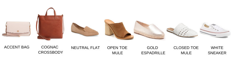 Accent Color Bag // Cognac Crossbody // Neutral Flat // Open Toe Mule // Gold Espadrilles // Closed Toe Mule // White Sneaker